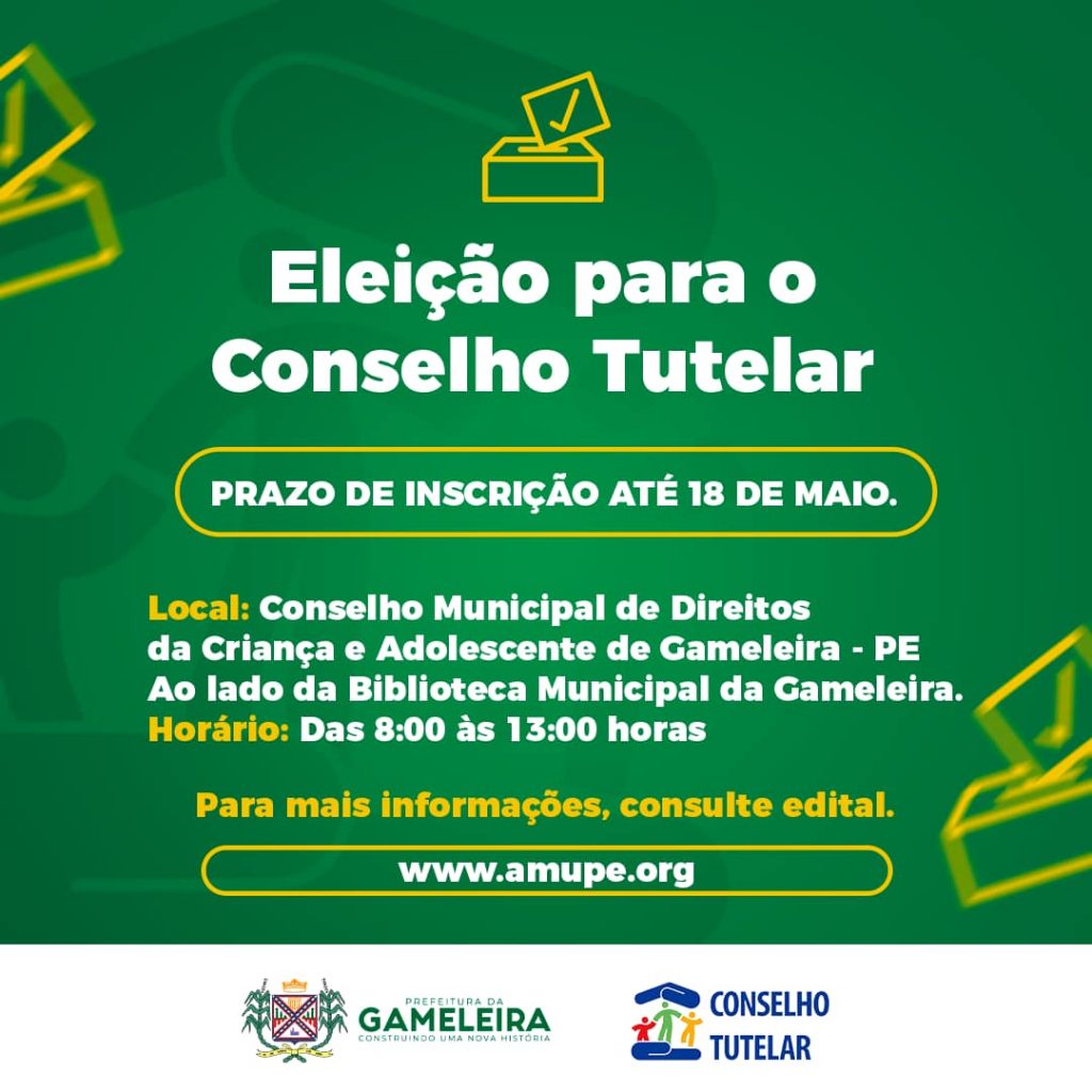 A Prefeitura Municipal da Gameleira informa que estão abertas as inscrições para a eleição de Conselheiros Tutelares até o dia 18 de Maio. O processo de seleção é fundamental para garantir a proteção e o bem-estar das crianças e adolescentes do município.✅
