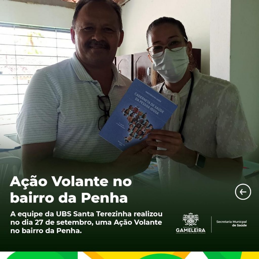 A equipe da UBS Santa Terezinha realizou no dia 27 de setembro uma Ação Volante no bairro da Penha. Na ação foi ofertada a Caderneta da Pessoa Idosa junto com uma palestra onde foi repassada as orientações sobre a saúde do idoso e a importância do uso da Caderneta da Pessoa Idosa, além de verificação da pressão arterial, da glicemia e avaliação antropométrica nessa população. ![]()